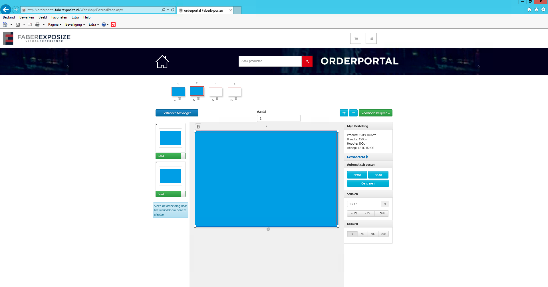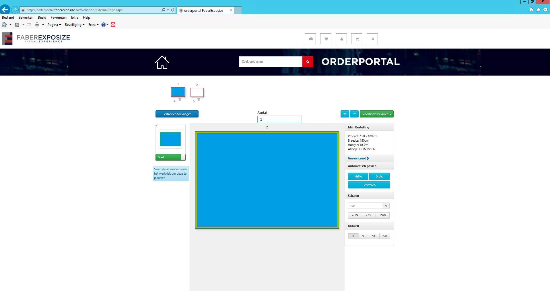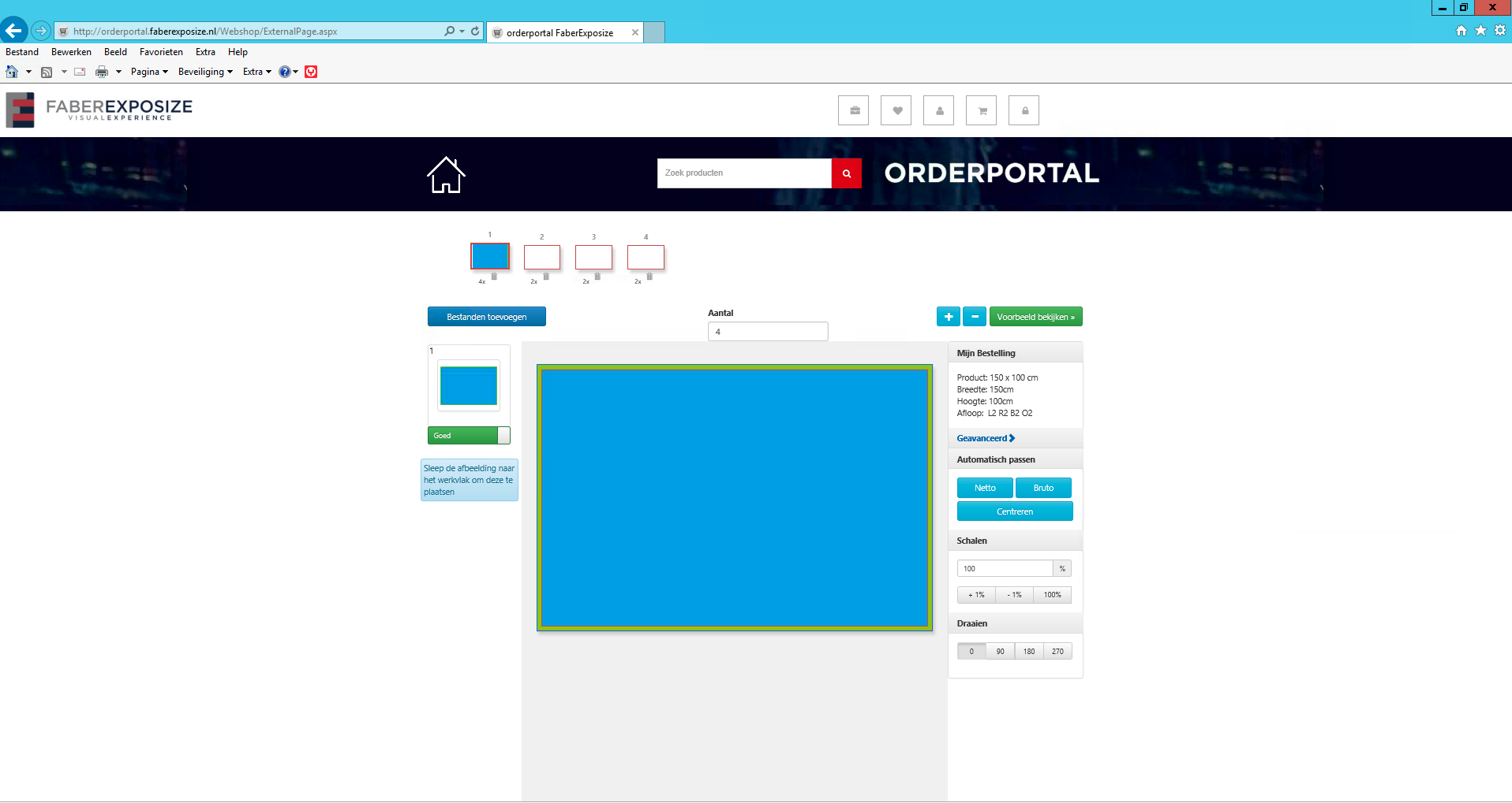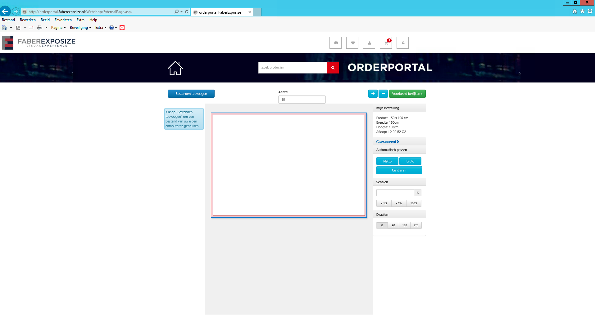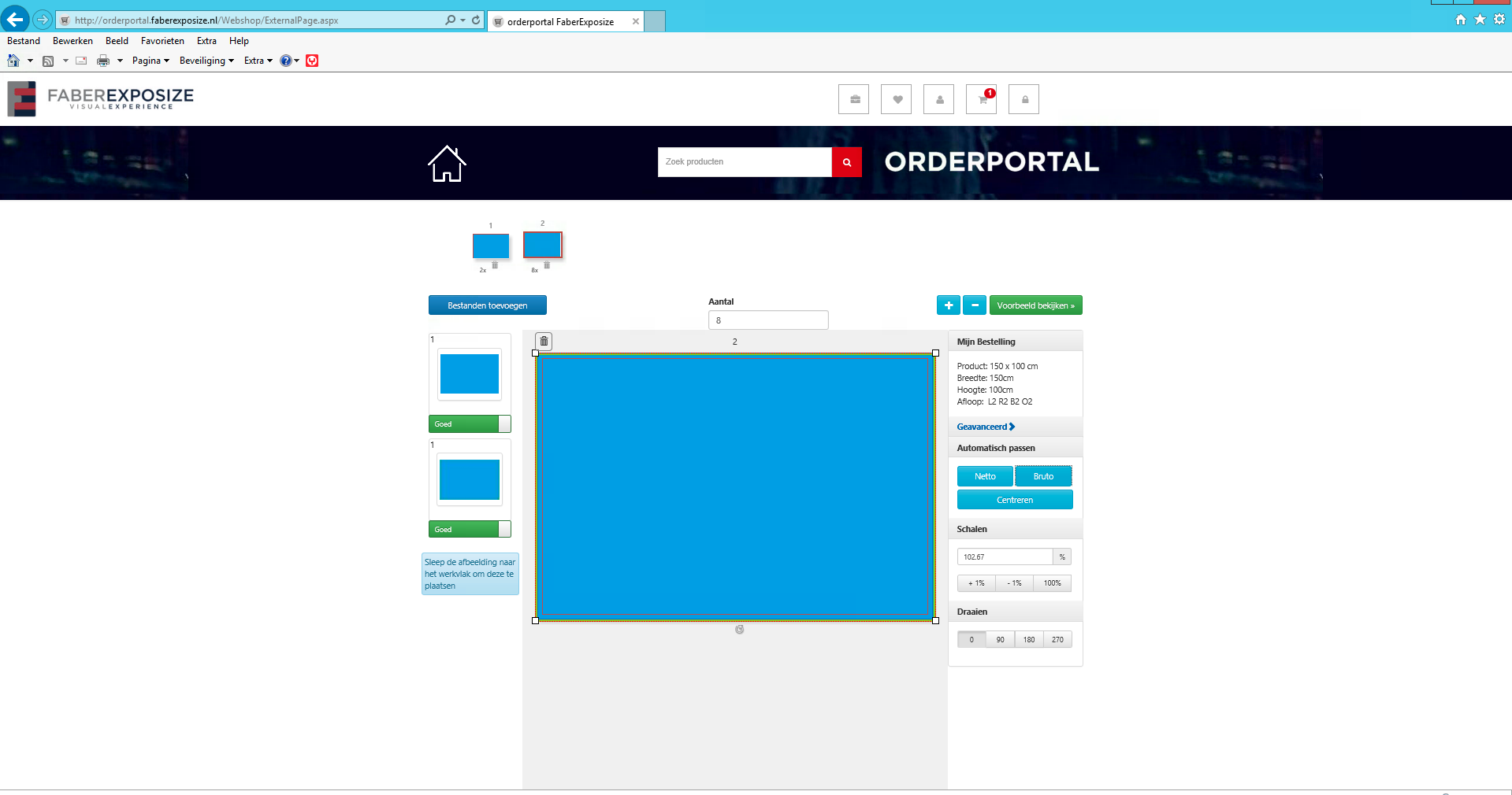 Wanneer u dit niet wilt, kunt u eenvoudig via de button netto aan de rechterzijde de geplaatste afbeelding weer terug op de trimbox (= netto maat) plaatsen en eventueel met de % iets vergroten zodat de afbeelding net iets in de afloop valt.