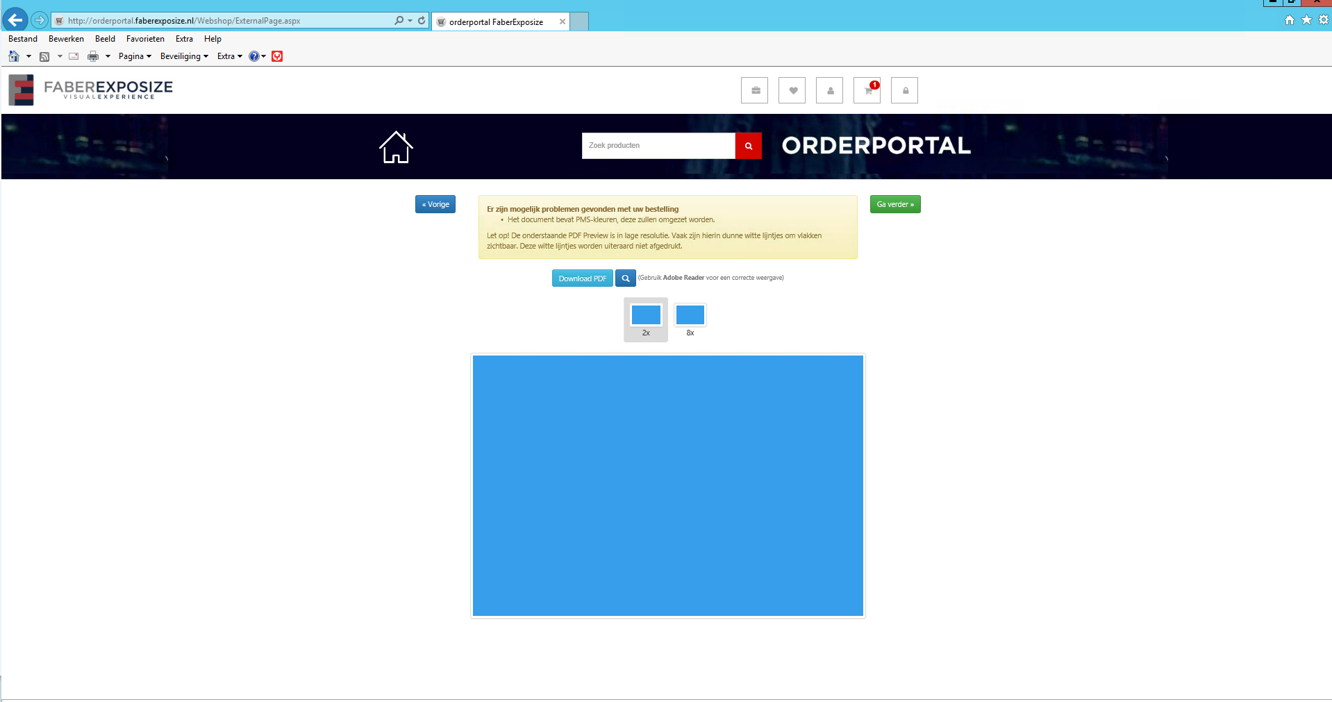 De uploadmodule laat u vervolgens van de geplaatste afbeelding(en) de netto afmeting zien en geeft eventueel nog informatie/waarschuwingen inzake PMS tinten en/of lage resolutie.